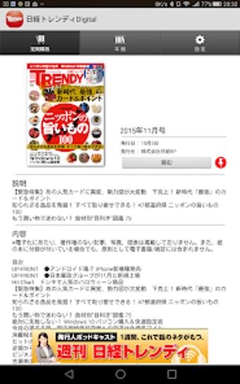 日経トレンディDigital adalah majalah digital yang menyajikan informasi tren terkini, dengan fitur yang memudahkan akses di perangkat Android. Aplikasi ini dirancang untuk memberikan pengalaman membaca yang optimal, terutama di layar smartphone dan tablet. Dengan tampilan mobile yang dioptimalkan, pengguna dapat menikmati artikel dengan lebih jelas dan nyaman. Selain itu, aplikasi ini mendukung mode tampilan kertas, memungkinkan pengguna melihat majalah dalam format aslinya, dan memiliki fitur teks yang memudahkan pembacaan di layar kecil.